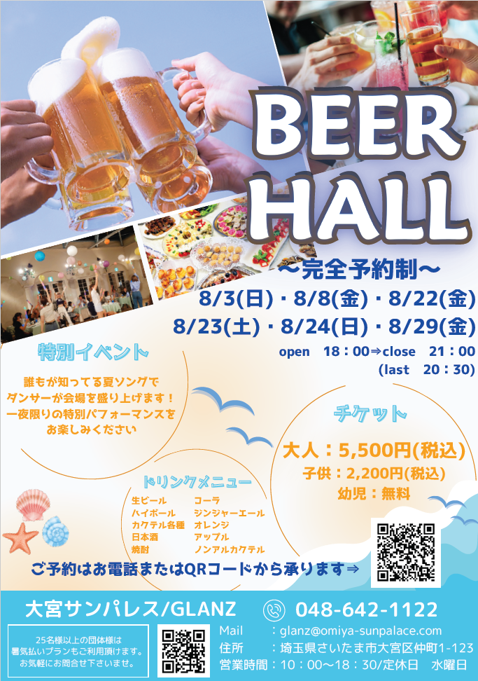 ビール、音楽、美味しい料理が揃った「BEER HALL」を開催します!