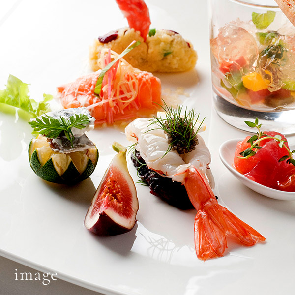 コース例:前菜・パン・スープ・魚料理・メイン料理・デザート - 飲物